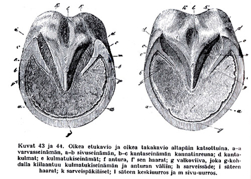 Tässä kuvassa näkyy hyvin mahdollisuus "optiseen harhaan" huomaa etukavion pyöreämpi muoto verrattaessa sitä takakavioon. Kavion keskikohta löytyy siis siten että: hyvinvuollun säteen kärjestä mitataan yksi sentti taakseppäin.Tai etsimällä se viivottimen avulla. Kavion keskikohdan taakse ei nauloja enään naulata sen takia että kaviomekanismi pääsee toimimaan vapaasti.
