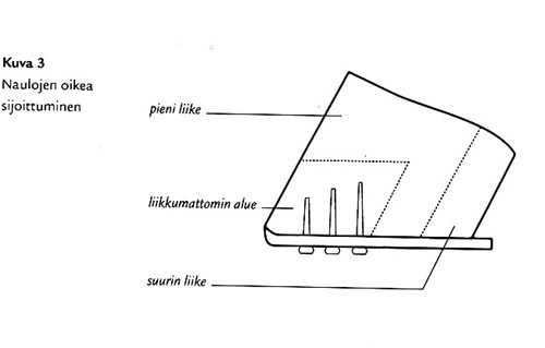 Naulojen sijoittelussa on eri koulukuntia. ELL Timo Kristolan mielestä kuvan mukaisesti naulatut naulat ovat oikealla alueella mutta korkein naulan ote pitäisi olla ensimmäisellä naulalla. |